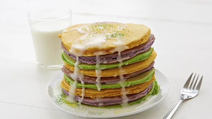 Step8Meanwhile, make the glaze: In a medium bowl, whisk together powdered sugar, lemon juice and water. Divide the glaze into three small mixing bowls. Dye one bowl's glaze yellow, another green and another purple (a combo of red and blue).