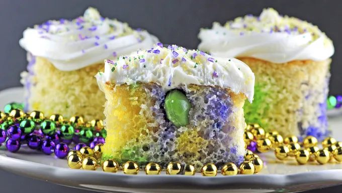 Step9Once cake is completely cooled, drizzle glaze onto the cake, alternating colors. Sprinkle poppyseeds on top, if desired. Take King Cake baby or a pecan half and tuck into the underside of the cake. Whoever gets the baby in his or her slice has to make the next cake!