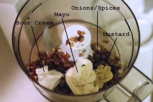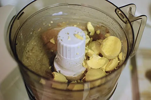 Step3Cut eggs in half and scoop out yolk. Put the yolk in the food processor with the onion mixture.