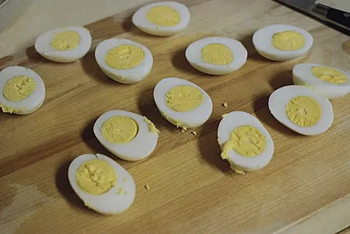 Step2Hard boil eggs - Place eggs in salted cold water. Bring to a boil and boil 1 minute. Remove from heat and let sit in the hot water for 10-12 minutes. Place in an ice bath for 5 minutes untill cooled. Peel.