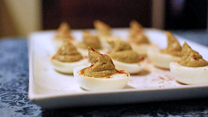 - Wanna know a secret? I hate deviled eggs. Not dislike... HATE! But I am a man that likes a challenge. I always try to cook things I haven't liked in the past hoping I can revamp them into something delicious. When I saw the idea of Indian spiced deviled eggs, I couldn't stop thinking about them! I thought that this might be the deviled egg preparation that I finally fell in love with. The outcome was great and actually turned a few deviled egg skeptics into believers. The other idea here is deviled egg roulette. This is a fun game you can play with many different apps, deviled eggs, meatballs, pigs in a blanket, etc. Make one or 2 of them hot! Really spicy! Let your guests know beforehand that there are a few spicy ones, then have a special prize for the person who gets the hot one. Choose carefully! No matter which you pick, these deviled eggs are delicious!