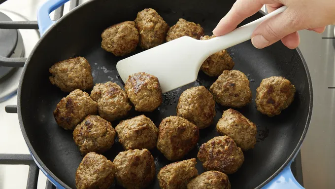 In 12-inch nonstick skillet, heat butter over medium-high heat. Add meatballs; cook 7 to 10 minutes, gently turning occasionally, until browned on all sides. Remove meatballs from skillet.