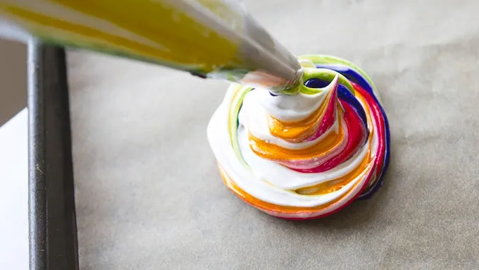 Step3In a large plastic food storage bag or plastic icing bag (fitted with a large start tip, if desired), draw a thin line up four sides of the bag with the gel food colorings. Propping the bag open so the gel food colors don’t mix together, use a large spatula to spoon the meringue mixture into the pastry bag. Twist the top of the bag closed.