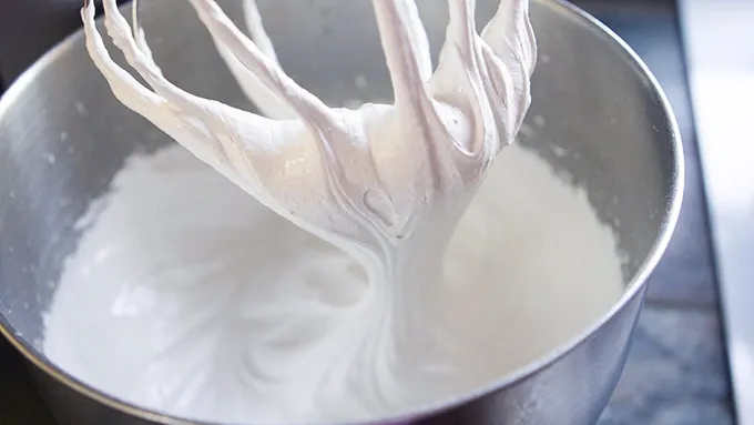 - To keep the meringue light and fluffy enough to pipe into bowls, you need the egg whites maxed out fluffy. So whip 'em until stiff and peaky.