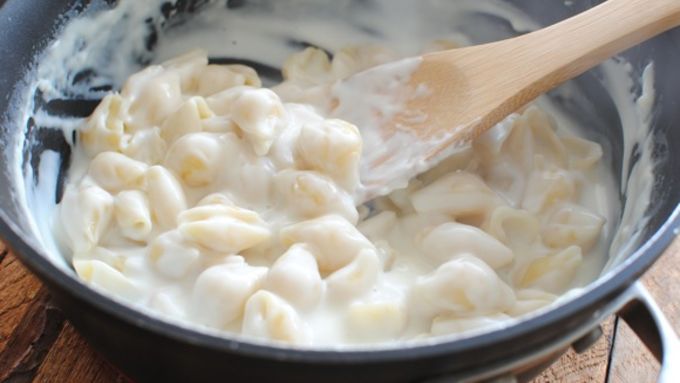 Step2Pour the milk into a saucepan. Add the shells and butter. Bring to a medium heat, but not a boil, stirring the entire time. When you reach a medium heat, lower the heat and continue to stir until the milk has thickened and the shells have absorbed most of the liquid and are al dente.