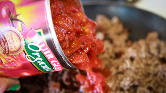 Step1Cook ground beef in a skillet over medium heat until browned. Add fire roasted tomatoes and Old El Paso™ Taco Seasoning Mix. Set aside.