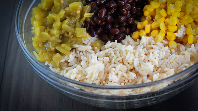 Step2In a large bowl, combine the corn, black beans, green chilies, 1-1/2 cups of sour cream, and rice.