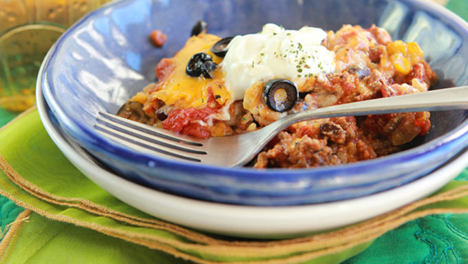 - Warm up yer bones with this Mexican twist on a comfort food favorite! Layers of rice, taco meat, and pure scrumptiousness come together all snappy like in this easy dish. Here's how it works. Autumn creeps up all colorful and fun like. Then one day you wake up and it's the bitter dregs of winter. You're cold to the marrow and not a thing can comfort you. Snuggies don't stand a chance. Running up the water bill and living in hot baths may be the only option. At least, that's what you think until you nab yourself a copy of our tres perf recipe for this Mexi-Rice Bake. Just enough spice to heat up yer gut, just enough heat to warm body and soul. Winter. It's a good thing. But don't try to survive without Mexi-Rice Bake. The end. Wanna make this incredibly delicious comfort-food bake? It's easier than you think and makes a pan full. So one night of cooking will feed a whole room, or a single body until the groundhog saves us from this chilly weather sometime mid-February! Throw off your woolen socks, toss aside your snowman sweater. Grab a spoon. This hot dish is all you'll need to stay warmy and smarmy this winter. Well, that and the occasional hot buttered rum. But, let's keep it simple tonight.
