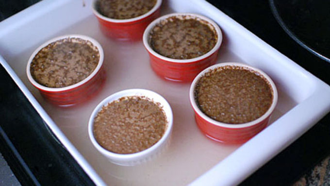 Step4Ladle into 3/4 cup baking cups. Place the cups into a baking dish and fill the dish with water about half way up the cups. Cover with foil and bake at 375°F for about a half hour. The center of the cups should still be jiggily when you shake it, but it will firm up the rest of the way in the fridge.