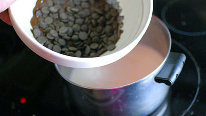 Step2Heat milk and cream until it is steaming, but be careful it doesn't boil over. Put the chocolate and spices in a large bowl and place it over the milk and cream so the chocolate warms and begins to melt. It doesn't need to fully melt.