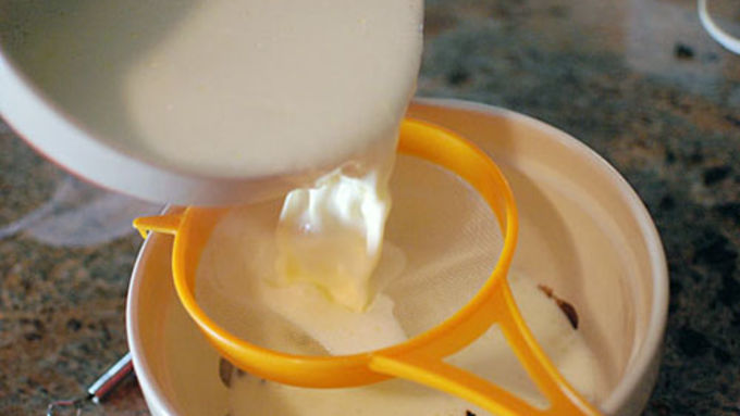 Step3Pour the hot cream into the egg mixture, whisking constantly. Strain this mixture with a fine mesh strainer into the chocolate and whisk until the chocolate is fully melted.