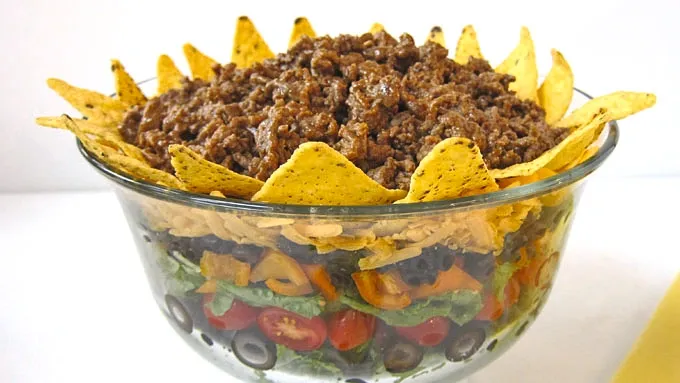 Step3Next, layer on the chopped peppers, followed by the black beans and shredded cheese. Arrange tortilla chips around the top edge of the bowl. Break remaining chips into small pieces and sprinkle over the salad. Top with hot taco meat. Garnish with sour cream, plus additional cheese and tomatoes as desired.