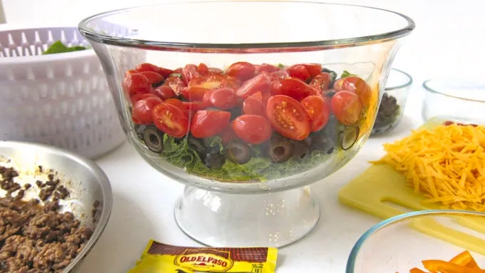 Step2In a large trifle bowl, use two thirds of the torn lettuce to create your base layer. Follow with sliced black olives and two thirds of the halved tomatoes. Top with remaining lettuce.