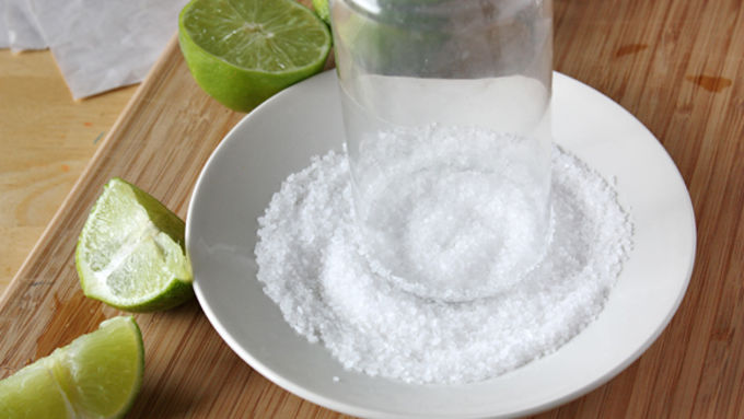 Step1Cut one lime in quarters. Use one quarter to moisten the rims of four glasses. Roll rims of glasses in coarse sea salt to coat. Cut 4 thin horizontal slices from remaining lime half to garnish glasses. Set glasses aside.