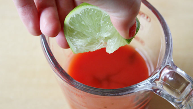 Step2In a small bowl, combine juice of limes (including the remainders from the sliced lime), tomato juice, soy sauce, Worcestershire sauce and hot sauce. Stir to mix.