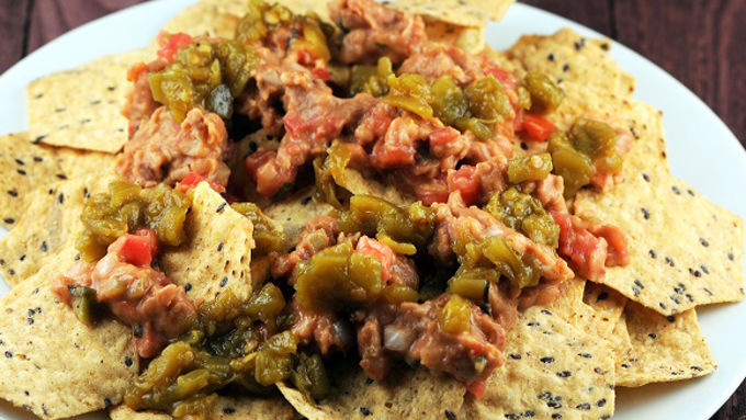 Step4Sprinkle green chilies on top of the bean mixture and chips.