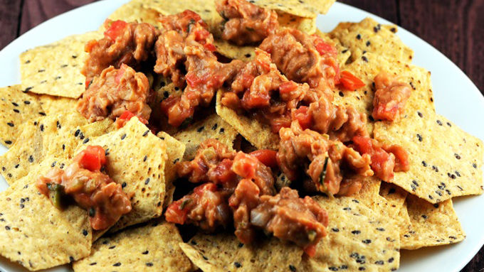Step3Drop spoonfuls of the bean and Pico de Gallo mixture onto the chips.