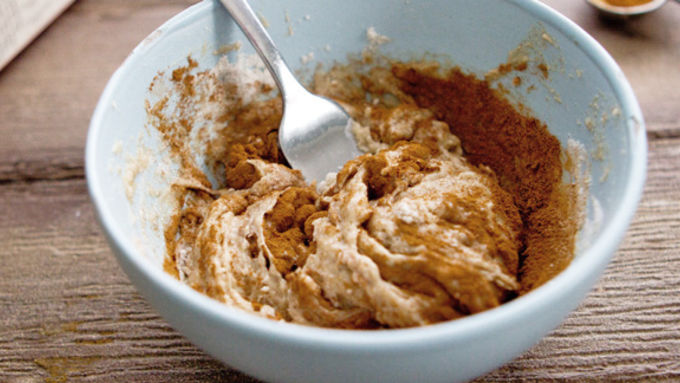 Step1In a small bowl, stir together cake mix and applesauce. Fold the cinnamon in just slightly, so ribbons of it are swirled into the batter.