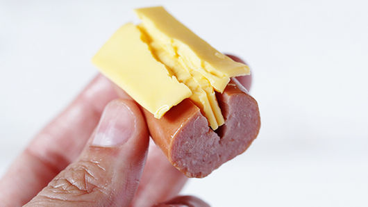 Take a hot dog third, and use a knife to slice down the length of the hotdog almost all the way through. Stuff one of the small pieces of cheese in the slit.