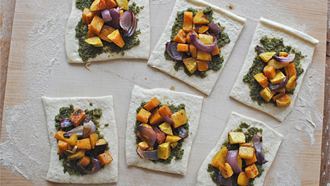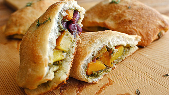 Incredible mini-calzones filled with roasted butternut squash and sage-walnut pesto.