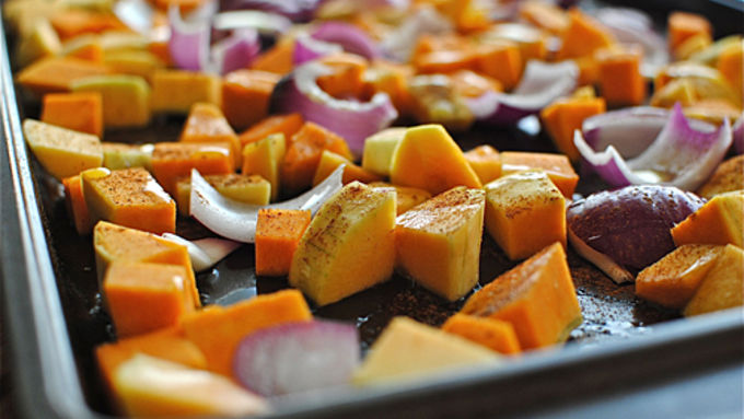 Step2On a rimmed baking sheet, toss the squash, red onion, cinnamon, all-spice, a pinch of salt and pepper with a tbsp. oil. Roast for 30 minutes, tossing at the 20-minute mark. Remove from oven.