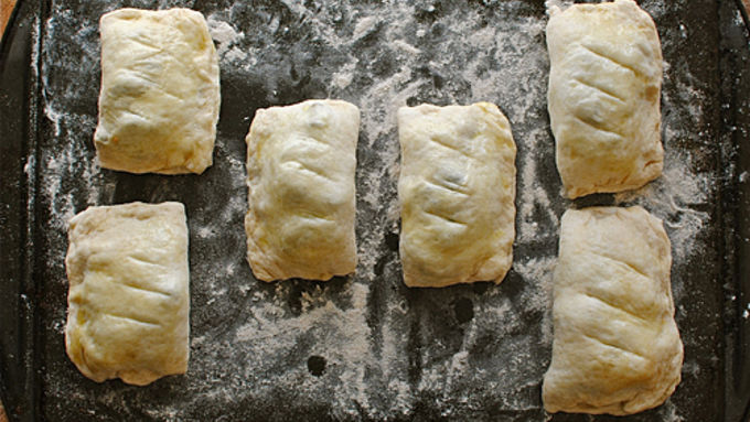 Step4Roll out the Pillsbury™ pizza crust onto a floured surface. Using a pizza cutter, divide the dough into 6 squares. Spoon a little of the pesto on each square, and top with roasted veggies. If you feel like it, sprinkle a little more cheese on top. You should probably feel like it. Pull over one side of the dough, meeting the other side, and press the edges together, sealing the little calzone babies.