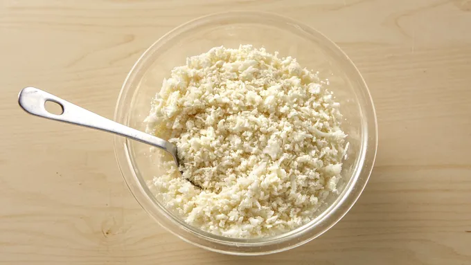 Using a box grater or a food processor, shred cauliflower into crumbles. Reserve 4 cups; store the remainder in the fridge or freezer for future pizzas.