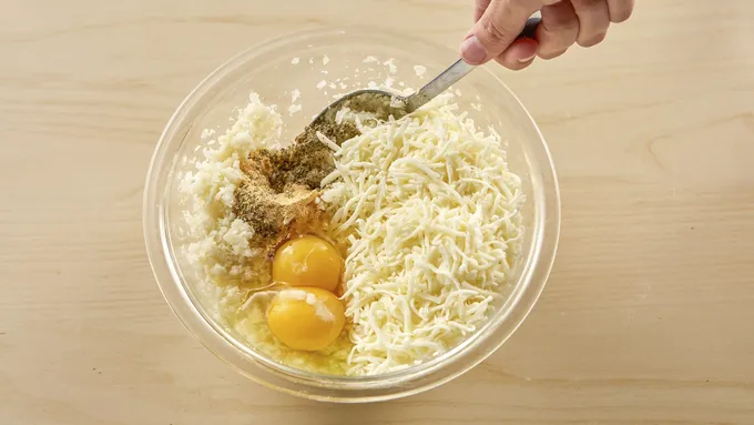 Add eggs, 2 cups shredded mozzarella cheese, oregano, basil and garlic powder and stir to combine. Preheat oven to 450°F.