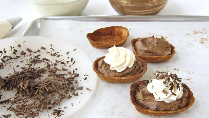 Step1Preheat oven to 400°F. Line a baking pan with parchment paper and stir together the sugar and cinnamon. Brush the inside of each tortilla bowl with butter and sprinkle on cinnamon sugar, dumping out excess. Brush butter around the outside of each tortilla bowl and sprinkle with remaining cinnamon sugar. Set on parchment paper-lined baking sheet. Bake for 8-12 minutes until golden brown and crispy. Remove and allow to cool completely. Fill with mousse and garnish as desired (options below).