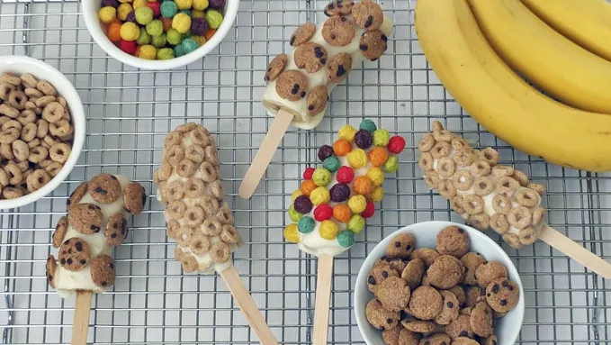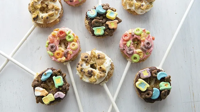 Ready-made frosting and favorite breakfast cereals turn little donuts into fun little no-bake donut pops.