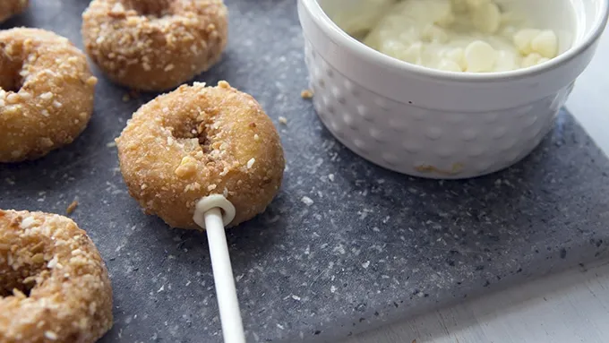 Step1Place mini donuts on a piece of parchment paper. Dip sucker sticks in melted white chocolate and gently press them through the bottom of each donut.