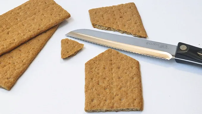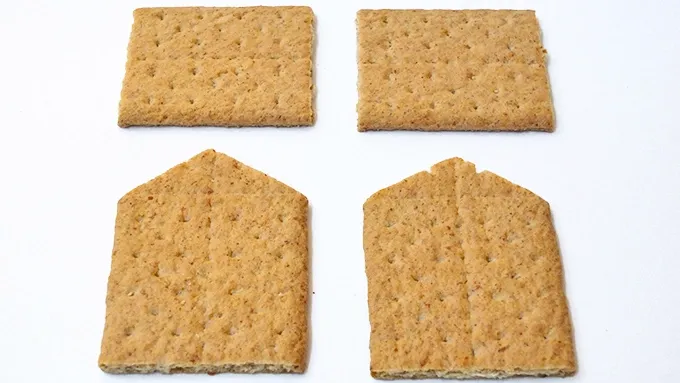 Step1With a sharp, unserrated knife cut 2 full graham crackers so they have a point on the top like a roof peak.