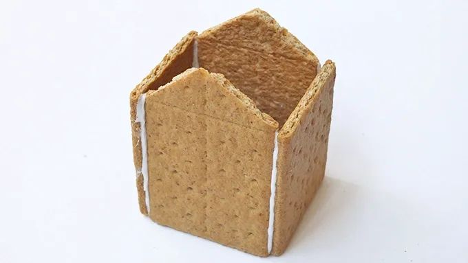 Step5Attach graham crackers so they form the base of the house. Let dry for approximately 15 minutes to set.