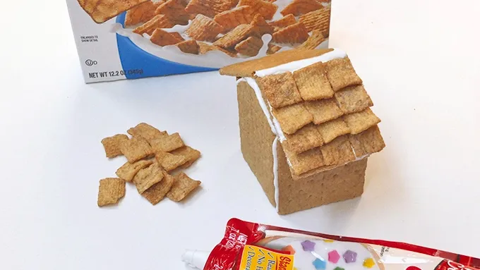 Step6For the roof, cut a full graham cracker in half. Attach to the top of the house with cookie icing. For the roof tiles, attach Cinnamon Toast Crunch™ cereal with cookie icing, overlapping the rows slightly. Or place the cereal on the roof in a diamond pattern with red-hot candies between the shingles for a festive look.