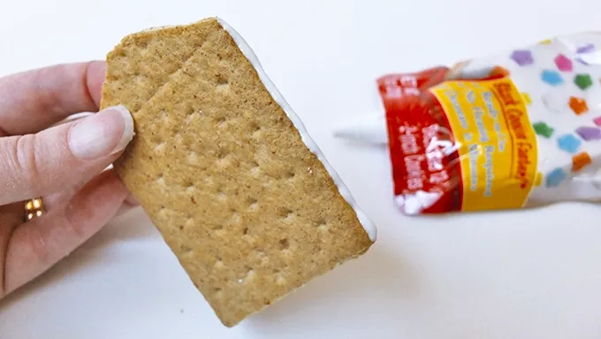 Step4Pipe a line of cookie icing on the edges of the graham crackers.