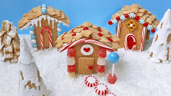 - By using graham crackers and Cinnamon Toast Crunch Cereal you can easily make an entire village of sweet, festive houses. Decorating gingerbread houses was one of my favorite things to do during the holidays when I was little. It was so much fun! It was also a chore. Baking the gingerbread, making the icing and then holding it together until you thought your arms would fall off before it would set. The worst part was when the roof slid off. Then you knew you were doomed to start all over. Store-bought cookie icing and graham crackers change all that. I found that Betty Crocker’s Cookie Icing pouches are easy to pipe, and the icing sets up fast. I was able to get to the fun decorating part in a matter of minutes! (Not to mention I didn’t have any clean up or prep.) So crank up that Christmas music, and let’s get started! Use your imagination and decorate your houses with sprinkles and candy. You can also use the cookie icing to make cute little icicles on the houses! Place on a bed of coconut for a sweet winter scene. So start your own hassle-free holiday tradition and have some candy-coated fun making a village of Mini Gingerbread Christmas Houses!