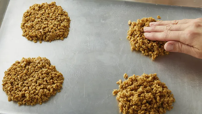 Step3Divide mixture, and form 4 rounds (about 4 inches in diameter and about 1/2 inch thick) at least 2 inches apart on cookie sheet. Bake 8 to 9 minutes or until lightly browned on edges. Cool completely on cookie sheet, 20 to 25 minutes.