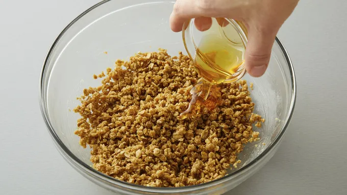 Step2Add granola to food processor; process 8 to 10 seconds or until coarsely ground. Transfer to medium bowl; add butter and honey. Stir until completely combined.