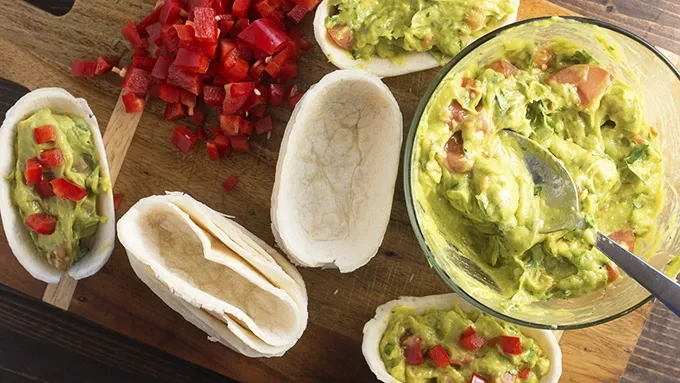 Step4Taste and add salt as needed. Spoon mixture evenly between the taco boats.