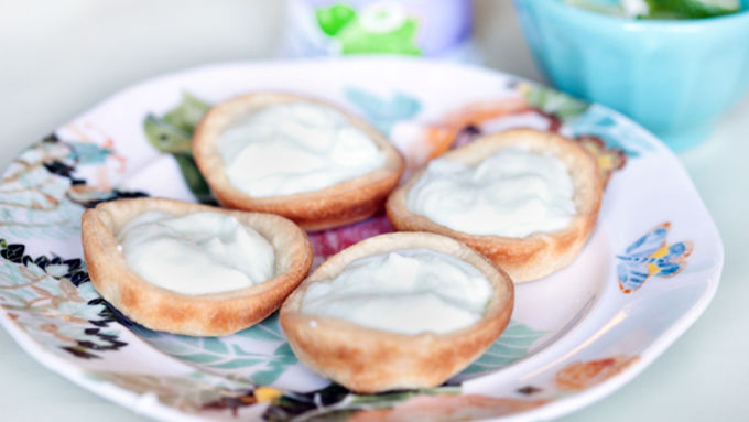 Step7Remove crust from cupcake pan and spoon in approximately 2 tablespoons key lime yogurt into each piecrust.
