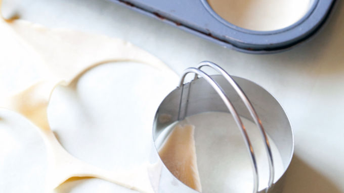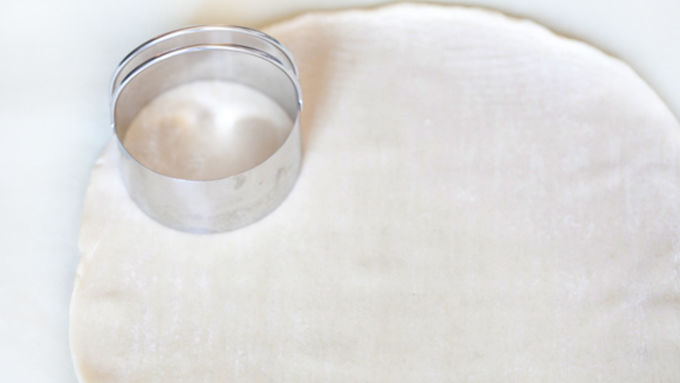 Step2Using a 3 1/2 inch round biscuit cutter, roll the dough out and cut six to 12 round circles (depending on how many pies you’re making)