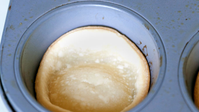 Step3Grease the cupcake pan and place the circles in each cupcake tin, pushing down to the bottom. Leave a small edge of crust to fill them.