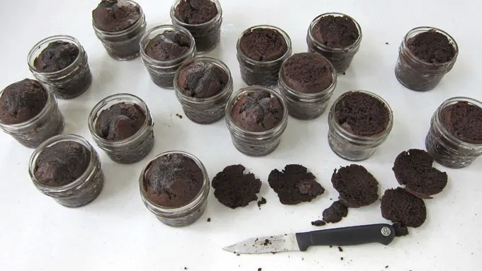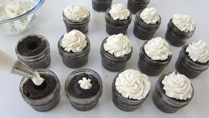 - If you love chocolate cake, you're gonna want to make a batch of these sweet treats! These rich chocolate cakes are filled with marshmallow cream frosting and served in mini glass jars with tiny spoons attached with pretty ribbons. They’re the perfect size dessert for a party or a bake sale! Every bite tastes like a little bit of heaven. To dress up your mini jars, use double-sided tape to attach a cute ribbon around the top lip of the jar. Leave a small opening in the taped area so you can insert a spoon between the ribbon and the jar. Your sweet little desserts are now ready to serve.