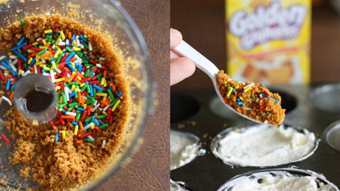 Step2In a muffin tin, pour about 2-3 tablespoons of crumb mixture into the bottom of 8 muffin tins. Press crumb mixture until firm. Note: You could also use paper liners in your muffin tin for easier removal. Reserve remaining crumbs for topping.