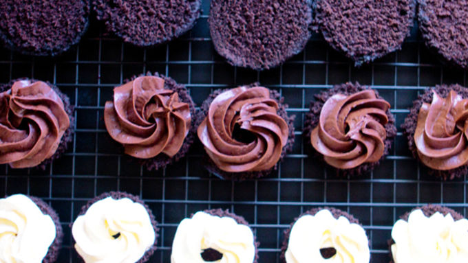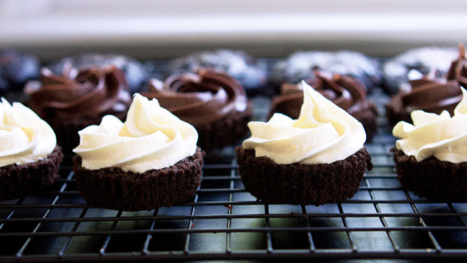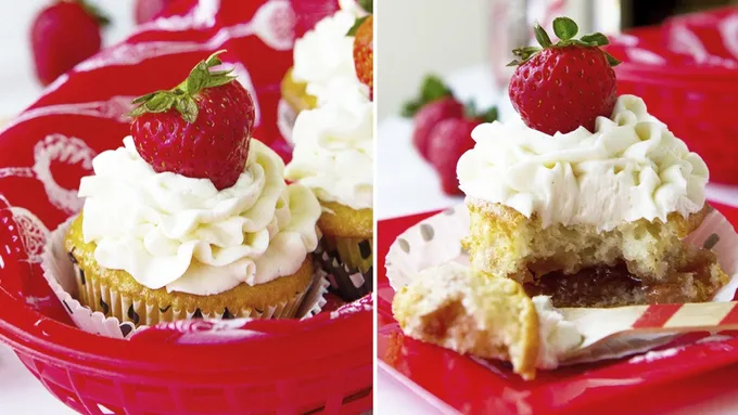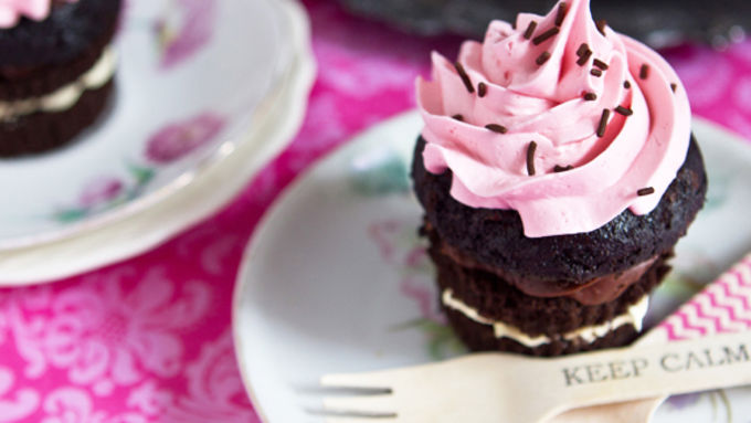 Step5Carefully assemble the cupcakes by placing the second layer on top of the first, frosting sides will be pointed up for both layers. Place the top of cupcake on the chocolate frosting layer, then pipe strawberry frosting on top of the each cupcake from a pastry bag fitted with a large star tip. Serve and enjoy!