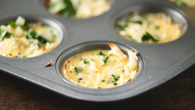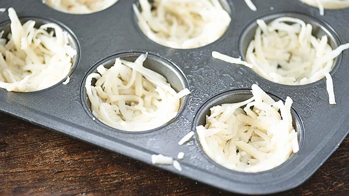 Step2In a medium bowl, combine the hash browns and flour. Press the hash browns evenly between 10 muffin wells to form the crust. Bake for 15 minutes or until the edges are beginning to brown.