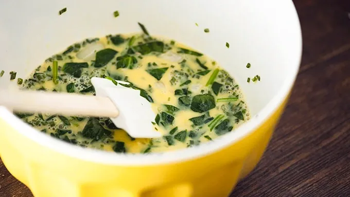 Step4In a medium bowl, beat together the eggs and milk until frothy. Stir in the cheese, salt and pepper. Add in the onion and spinach.