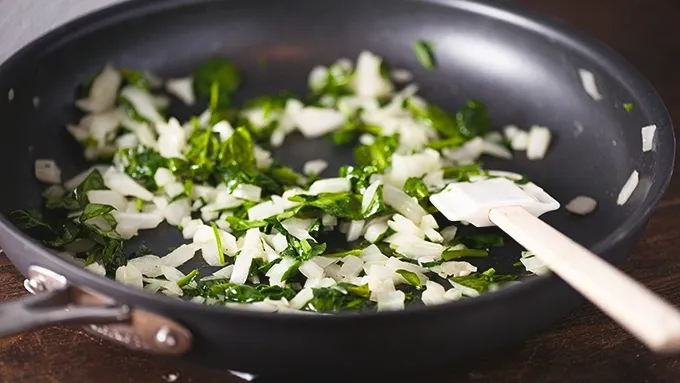 Step3While the hash browns are baking, dice the onion and chop the spinach into small pieces. Heat a large nonstick skillet over medium heat. Add the olive oil. When the oil is hot, add the onions and cook 5 minutes, stirring often, until softened. Stir in the spinach and continue cooking for 2 minutes or until wilted.