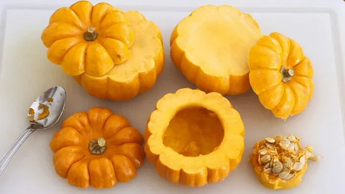 Step2Cut off the tops of the mini pumpkins and use a spoon to hollow out the interior. Leave at least 1/4-inch of pumpkin flesh around the perimeter.