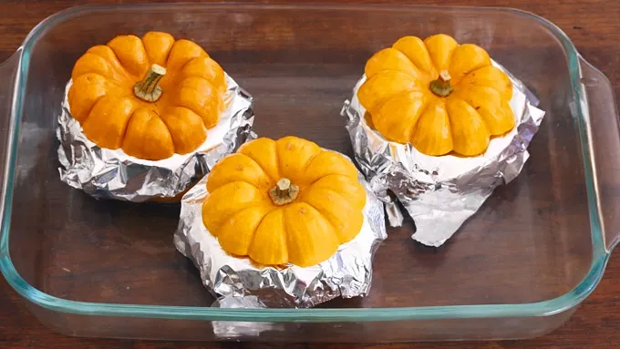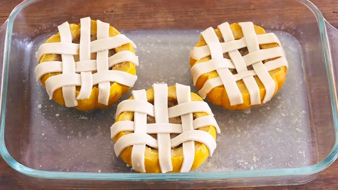 Step4Wrap some aluminum foil over the pumpkins and place the pumpkin lids on top. Bake for 35 minutes. Then remove the pumpkin lids and set aside so they don’t over bake. Remove the pumpkins from the oven, remove the foil, and reduce the heat to 400°F. Let the pumpkins cool for 5 minutes before putting the lattice pie crust on top, otherwise the dough will melt.